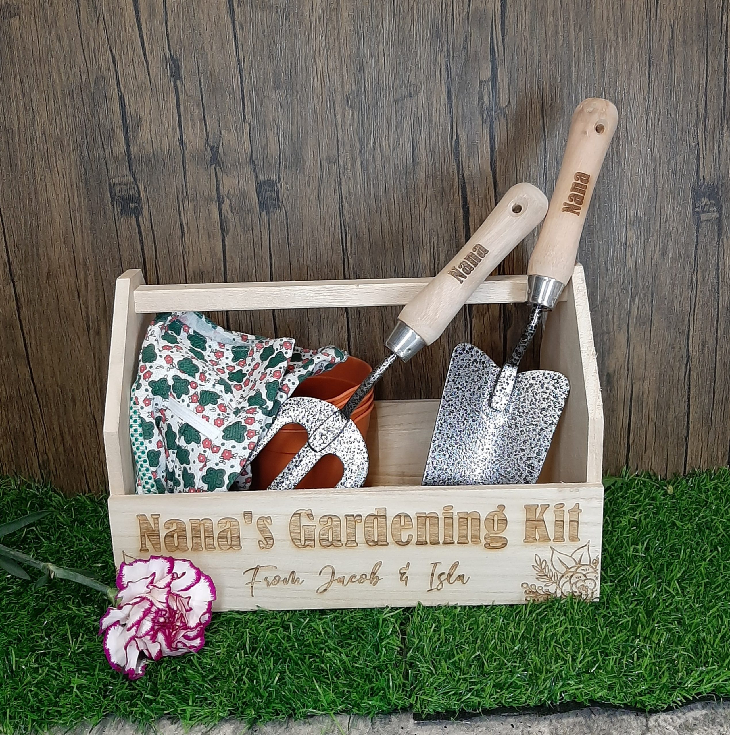 We have brought you a Gardening Kit which features a wooden crate with handle – displaying your choice of wording and even a personal message, A fork and trowel both with your chosen name engraved on the handle and even a pair of gardening gloves.